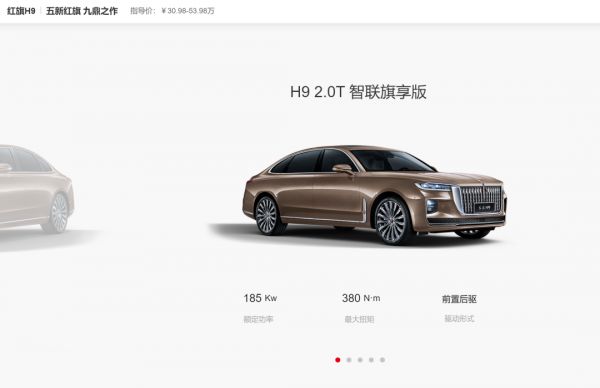 据红旗官网显示,红旗H9是一款C+级豪华轿车,官方指导价为30.98万元~53.98万元。