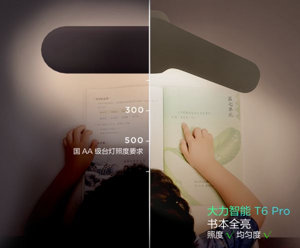 以大力智能学习灯T6系列为例,作为国 AA 级专业护眼产品,其双翼灯头专利设计,灵感源于医学“无影灯”,其照明范围更广、光照更均匀、写字时手下阴影少,避免孩子出现歪头看字等问题。