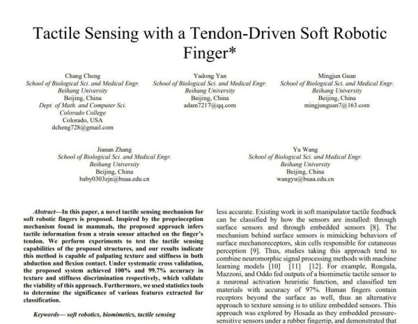 该研究已在论文预印本发布平台arXiv上预发表,论文题目为《用肌腱驱动的软机器人手指进行触觉感知(Tactile Sensing with a Tendon-Driven Soft Robotic Finger)》