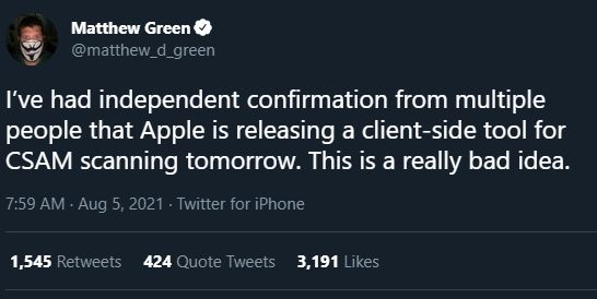 昨天,约翰·霍普金斯大学加密学教授 Matthew Green 在 Twitter 上突然爆出一条大新闻:多名知情人士确认,苹果即将发布一项用于扫描检测儿童色情虐待内容 (Child Sexual Abuse Material) 的端侧工具。