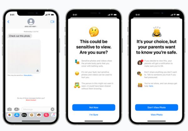 用户在 iMessage 上收到或者发送照片。系统会在后台完成比对检测工作。如果系统认为它属于露骨内容,iMessage 就会暂时屏蔽掉这张照片、询问,并再次确认用户是否要浏览或发送这张照片。