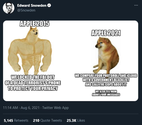 “棱镜”计划的爆料人爱德华·斯诺登也对苹果此举颇为不满,甚至在 Twitter 上发布了一张梗图吐槽: