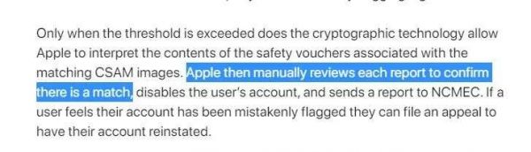 如果涉事照片被判定为儿童色情虐待内容,苹果的服务器将可以对照片进行解密,并且交由人工进行二次审核。