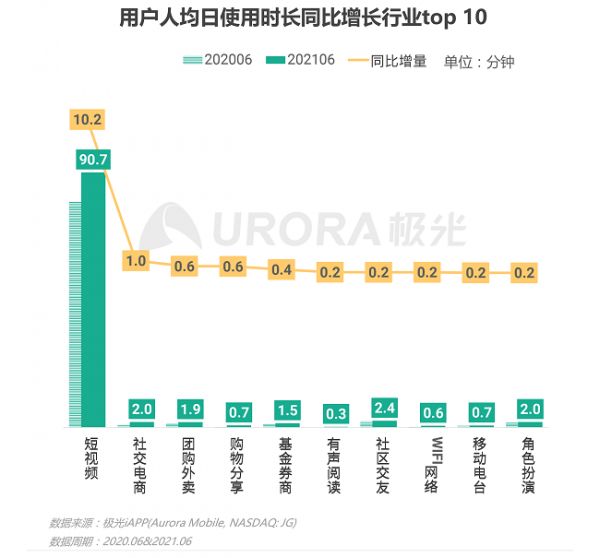 此前,中国互联网络信息中心发布的一份报告显示,截至2020年12月,中国网民规模9.89亿,其中,短视频用户规模高达8.73亿,占整体网民的88.3%。此外,极光近期发布的《2021年Q2移动互联网数据研究报告》也显示,今年第二季度,在所有APP中,短视频行业用户时长占比达29.8%,用户人均日使用时长达90.7分钟,同比增量达到10.2分钟。