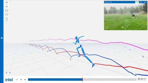 我们熟知的计算机硬件厂商英特尔,带来3D运动员追踪(3DAT)技术,通过每秒60帧录像对运动员动作进行AI分析。3DAT适用性最强的项目是田径赛跑和足球,会将画面中记录的运动员轨迹转化为运动建模,直接解析出冲刺速度、加速度和生物力学等数据,辅助判断和训练。