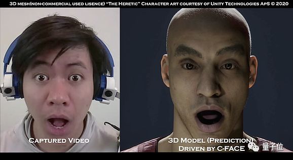 △左侧为使用者佩戴C-Face,右侧为3D模型反馈的面部表情。