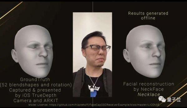 △左侧为手机摄像头识别处理的结果,右侧为NeckFace面部重建的结果。