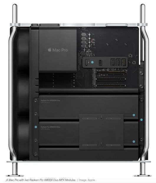苹果还表示,Mac Pro可以容纳两个模块,因此用户可以拥有多达4个GPU!