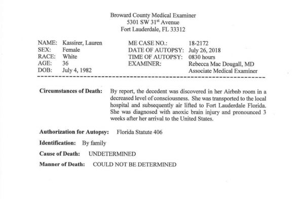 布劳沃德县(Broward County)法医报告显示劳伦·卡西尔的死因和方式列为“尚不确定”。资料来源布劳沃德县法医