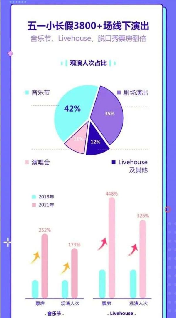火爆的不止是音乐节,从大麦发布的《2021五一档演出观察》来看,演唱会、Livehouse、剧场演出、脱口秀等各类线下演出在五一都很火热,其中Livehouse票房飙涨448%。