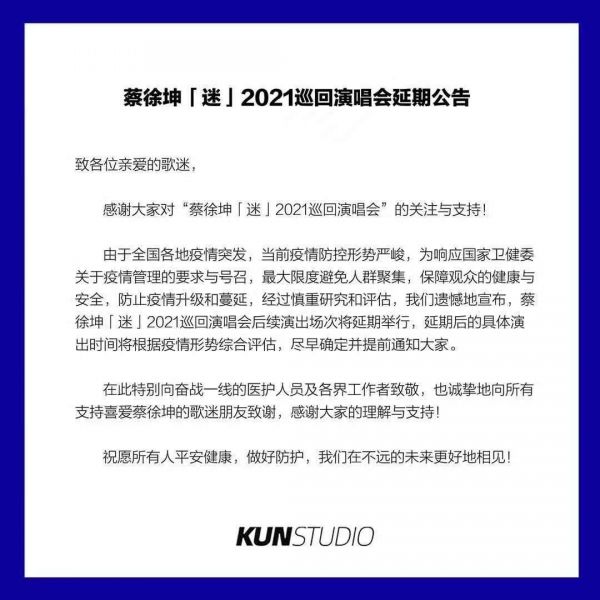 作为本轮疫情的始发地,南京的各类大型演出最先做出延期、取消的决定。包括汪峰、张杰、蔡徐坤等,南京至少有6场大型演唱会宣布延期。据媒体报道,江苏省已审批的拟于8月份举办的19场大型活动已全部取消或延期,文娱场所、线下培训机构已分别采取暂停营业措施。
