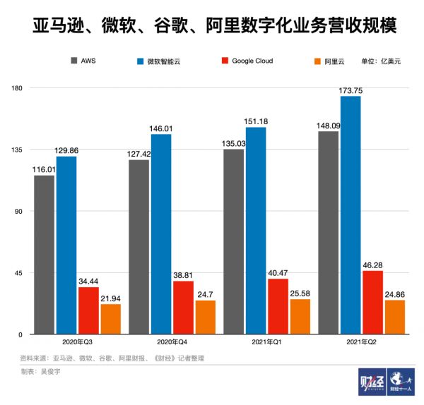 从全球范围看,亚马逊、微软依旧维持着前两强位置,谷歌云成为增长黑马。市场调研机构Synergy Research最新数据显示,2021年二季度全球企业在云基础设施服务(IaaS+PaaS)上的支出达到420亿美元(约2712亿元,同比增长39%。亚马逊、微软、谷歌增速明显,位居前三强,市场份额分别为33%、20%、10%。阿里云位居第四,Synergy Research并未公布其市场份额数据。