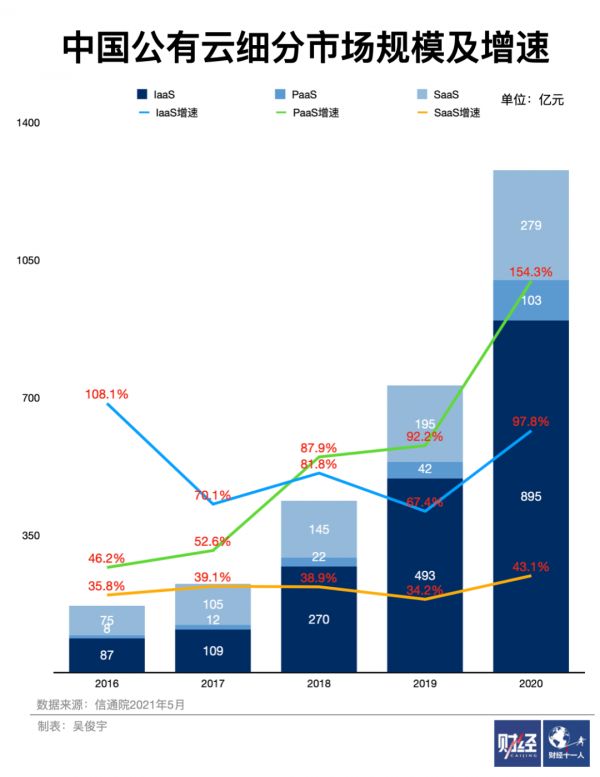 中国信息通信研究院最新数据显示,2020年中国公有云IaaS市场规模为895亿元,PaaS市场为103亿元,SaaS市场为279亿元。三个细分市场增速快,IaaS市场增速高达97.8%,PaaS市场同比增长高达154.3%,SaaS市场增速为43.1%。