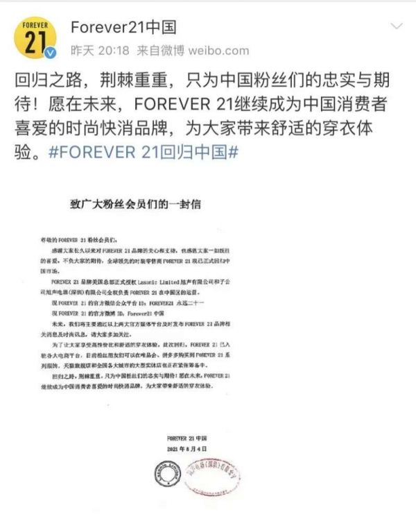 就在8月4日晚间,沉默许久的Forever21微信公众号官宣了回归中国市场的消息。声明中提到,Forever21品牌美国总部正式授权Lasonic Limited旭声有限公司和子公司旭声电器(深圳)有限公司全权负责Forever21在中国的业务运营。