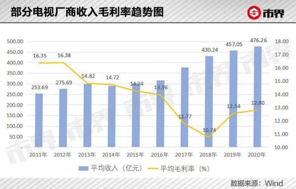 从A股的海信视像、深康佳A、四川长虹以及港股的TCL电子几家上市公司数据来看,平均收入从2011年的253.69亿元增至2020年的476.26亿元,但毛利率从16.35%降至2018年的低点10.74%,近两年小幅回升至12.8%。(想了解更多关于毛利率的“秘密”?请点击此处)