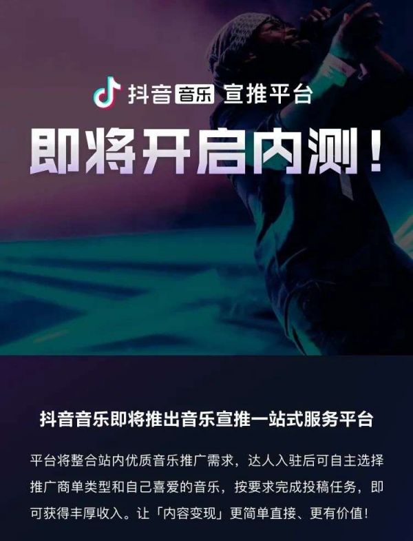 作为抖音短视频变现新玩法,抖音音乐宣推平台平台以万粉的低门槛便能成为达人,通过接单制,创作短视频获得流量红包激励,类似于“音乐版星图”。而通过公开宣传可知,“将整合站内优质音乐推广需求,入驻达人按要求完成投稿任务,获得丰厚收入”,其本质是进一步打破音乐传播的门槛,实现音乐营销的进一步去中心化。