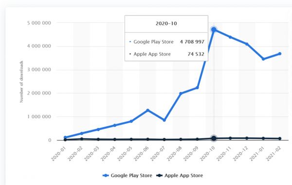 在2020年3月上线的Resso,仅仅半年后其下载量超1500万次。根据statista的数据显示,Resso在Google Play Store的下载量在2020年10月达到顶峰,单月下载量达470万,到2021年2月,下载量也保持在平均每月350万左右。