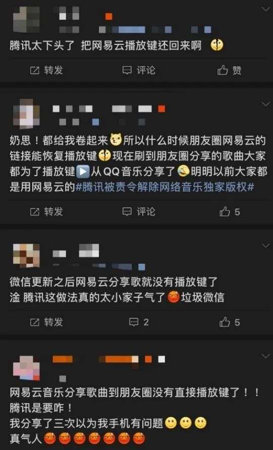 值得一提的是,有网友提出,如果通过网易云音乐分享歌曲到朋友圈,歌曲便没有了播放键,只有通过TME旗下音乐平台分享歌曲才能够直接在微信内部播放。腾讯准确地击中了朋友圈社交的痛点,虽然引来一众网友的“问候”,但是不愿意接受分享的歌曲无人听的“无效社交”,一个播放键的“小心思”,也确实留住了不少用户。