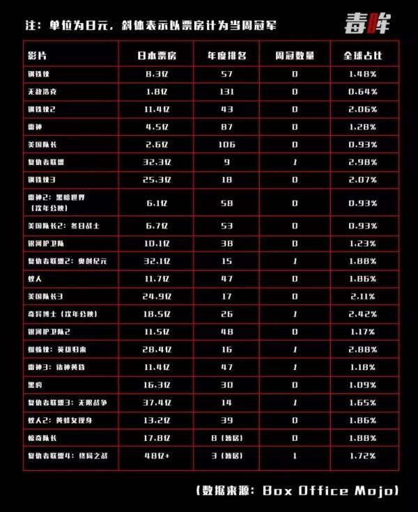 梳理“漫威电影宇宙”在日本的成绩,便会发现好莱坞头号吸金系列电影,在日本居然屡战屡败——2019年以前,漫威电影在日本的最好成绩不过是《复仇者联盟》的年度第九名,不少电影在日本年度票房排行榜上位列四五十位。