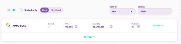 而后,AMPL 上线 PancakeSwap。Odaily星球日报日报查询发现,目前 Pancake 上 AMPL-BUSD 挖矿年化收益可以达到 145%。