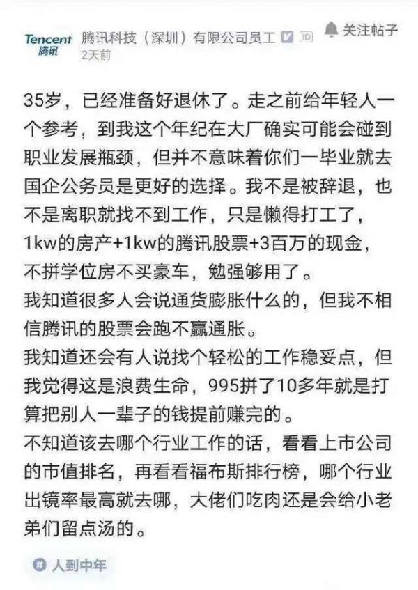 今年年初,一则腾讯35岁员工准备退休的帖子刷了屏。35岁就退休是因为他有三张底牌,1000万的股票+1000万的房产+300万的现金,相对于大部分打工人月薪不足6000的现状,这位仁兄已经秒杀了99%的同龄人,成功实现逆袭。