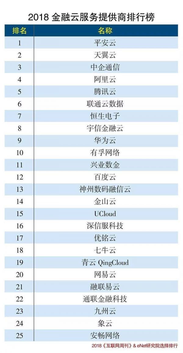 去年年底,《互联网周刊》&eNet研究院发布了《2018金融云服务提供商排行榜》,华为云排名第九,而霸占前三名的平安、天翼、中期通信(中信集团旗下),要么是和金融行业强相关,要么是传统的电信巨头,华为要从他们手里抢食,也并不容易。