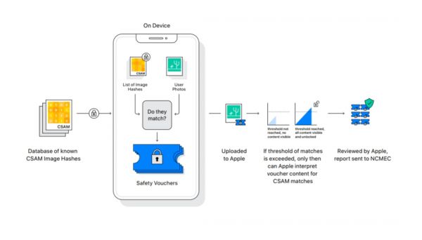 从图像我们可以清楚意识到,一旦该技术被用在iPhone、iPad等设备中,当用户将iCloud功能开启,所有的照片都会被系统“扫描”一遍,可能有些还会进行二次人工审核。