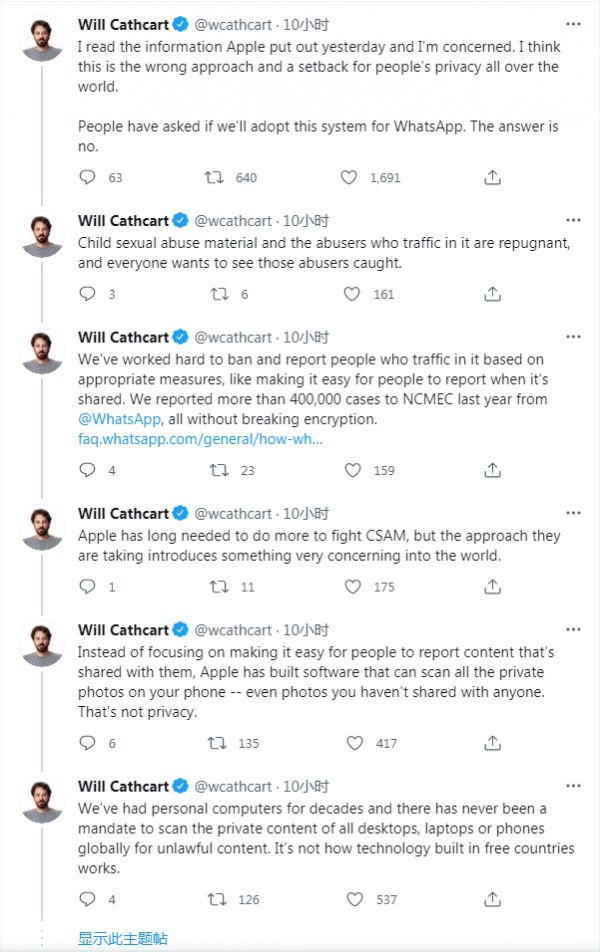 不过,Facebook旗下即时通讯应用WhatsApp负责人Will Cathcart在接受媒体采访时已经明确拒绝在平台上采用类似系统,更是在推特上连发数条进行“谴责”,表示: