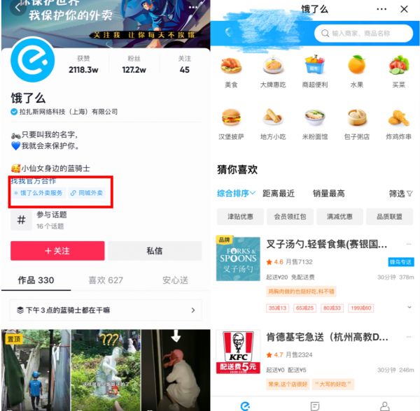 第一种路径是通过外卖平台的官方账号挂链接,直接跳转至平台下单页面,并且会自动匹配到点单所在的地理位置。饿了么抖音号,点击“饿了么外卖服务”下单,商品展示和服务是和饿了么官方app是完全打通的。