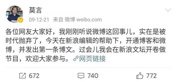 2009年微博开始内测,年底,莫言就在微博上开通了账号,分享自己的观点和作品。如今微博粉丝有423W。