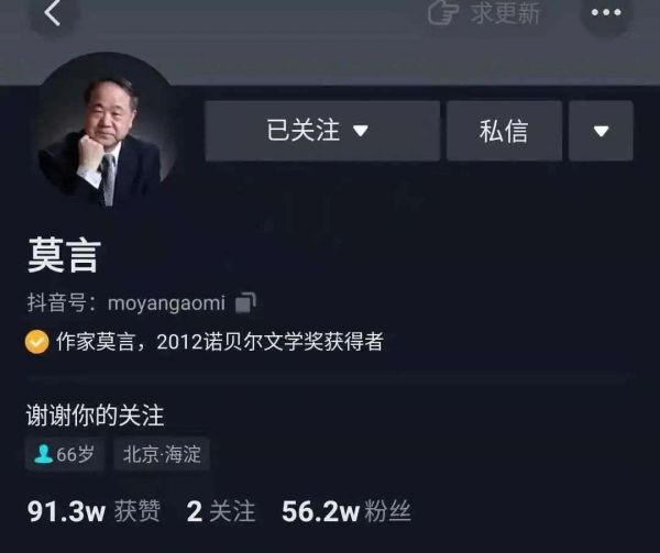 2020年莫言入驻抖音,第一条视频就是推荐新书《晚熟的人》,6小时获得了 11.3W个赞,而他参与的话题#寻找晚熟的人,浏览量当天便突破了3100W次。但可能是疏于更新,又或许是不适应短视频领域,诺贝尔奖的光环并没有给莫言带来巨大的流量。截至目前,莫言在抖音上有56.1W粉丝。