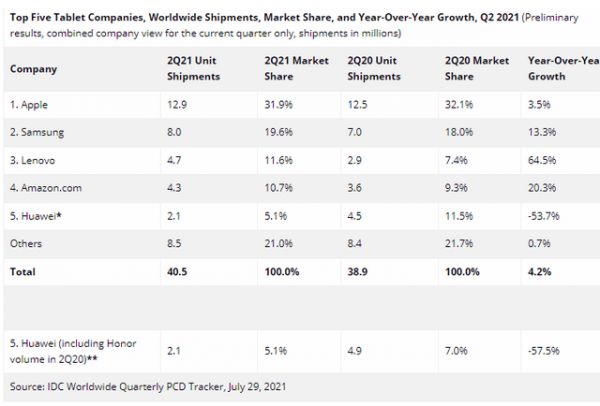 根据IDC的统计报告显示,2021年第二季度,全球平板电脑总出货量约4050万台,同比增长4.2%。其中,苹果iPad平板电脑的全球出货量约1290万台,市占率达31.9%,位居全球第一。三星的市场份额为19.6%,排名第二。联想位居第三,市占率约11.6%。华为平板电脑出货量约为210万台,同比下降了53.7%,市占率为5.1%。