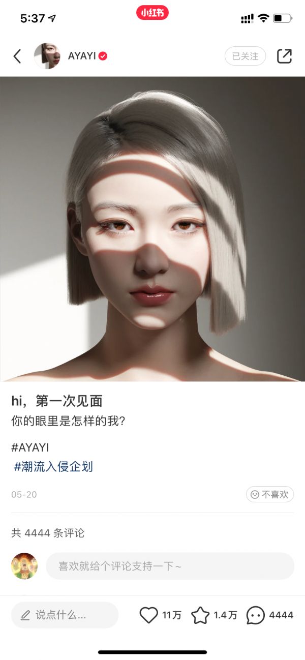 与之不同的是,今年5月上线的超写实虚拟人AYAYI的首发平台就锁定在小红书。首篇“露脸”官宣笔记的点赞量达11万,评论达1.4万,这应该是截止目前虚拟人在小红书互动量最高的一篇内容。