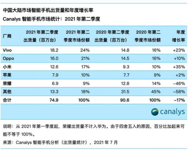 从Canalys的数据看,2021年Q2出货量最多的手机厂商分别是vivo、OPPO和小米,市场份额分别是24%,21%和17%。小米的国内市场份额依旧落后前两名,但从年增速来看,小米年增长率是35%,增速还是最快。