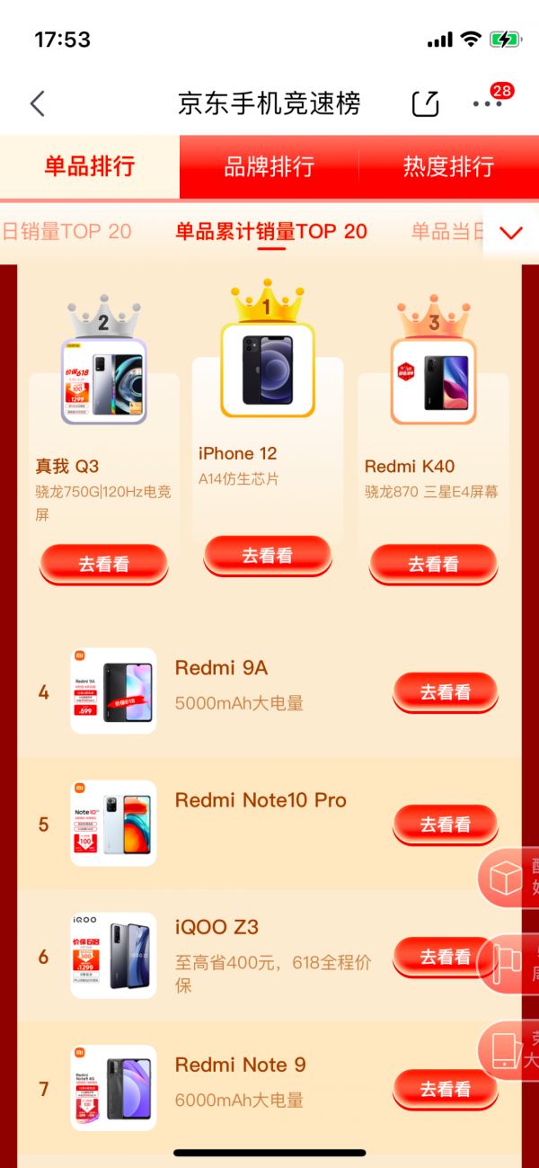 根据京东的618销量数据统计,销量最高的手机型号还是iPhone 12,一款高端手机抢占了手机整体销量榜首。余下的皆为小米和OPPO的低端子品牌,比如小米旗下的Redmi和OPPO旗下的Realme,以及vivo旗下的IQOO。