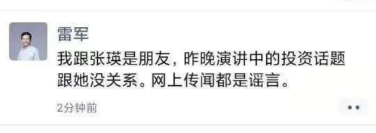 11日,雷军对此在朋友圈里回应:我和她是朋友,昨晚演讲中的投资话题跟她没关系,网上传闻都是谣言。
