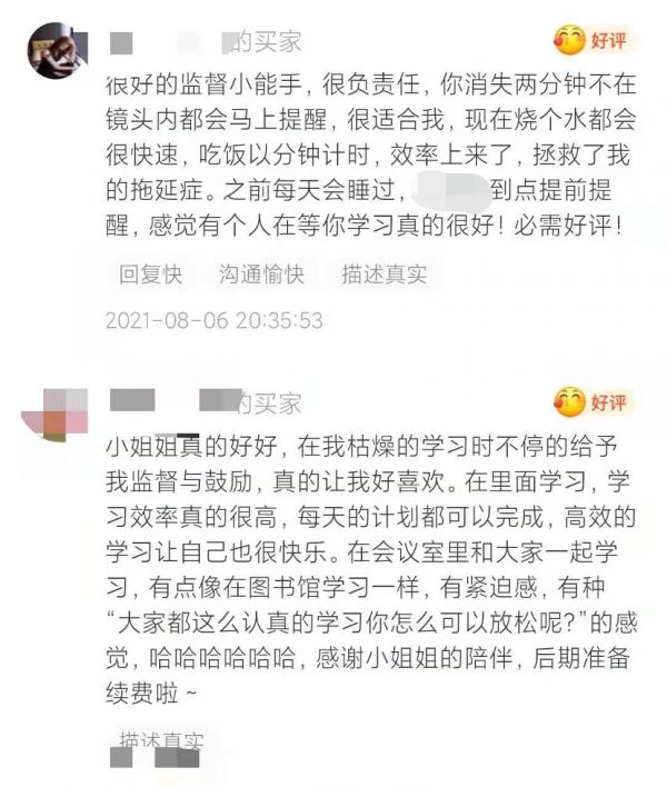 至于“温和派”学习监督,便是如“亲妈”一般苦口婆心地唠叨,让买家“重温”学生时代,时时刻刻保持较强的自制力。若买家仍觉得缺乏“压迫感”和学习的动力,她甚至能提供全程视频监督学习的服务,而费用自然也相应增加。
