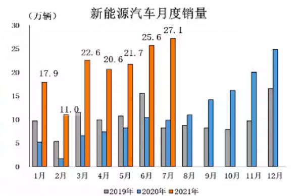 中汽协数据显示,7月新能源汽车产销分别为28.4万辆和27.1万辆,同比增长1.7倍和1.6倍,创造历史新高;1月-7月累计产销分别为150.4万辆和147.8万辆,同比增长均为2.0倍,纯电动以及插电混合动力车型均实现高速增长。