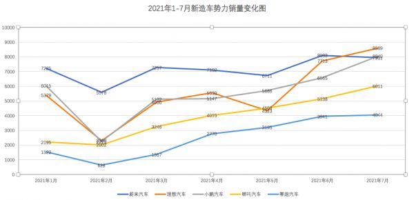 以“蔚小理”(蔚来、小鹏、理想)为代表的新造车企业,无疑是国产新能源中高端品牌的标杆。7月,小鹏汽车和理想汽车单月销量首次突破八千辆,分别销售8040辆和8489辆,同比增长228%和251.3%。蔚来汽车虽环比有轻微下滑,但仍处于历史高点,销量为7931辆。