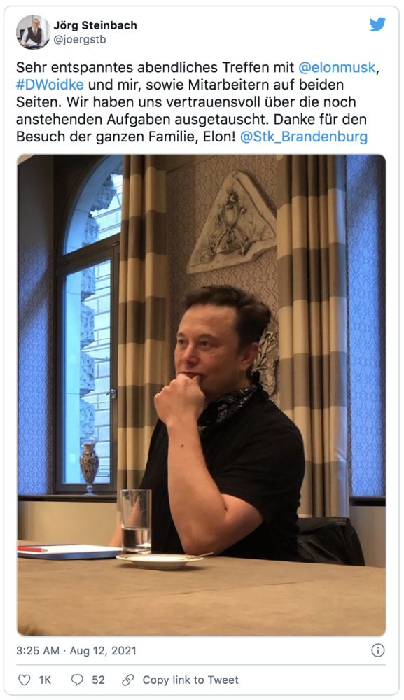 施泰因巴赫发布了一张马斯克的照片,并称勃兰登堡州州长迪特玛·沃伊德克(Dietmar Woidke)也参加了此次会面。