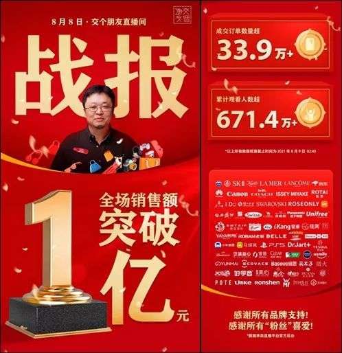8月8日,交个朋友直播间支付金额突破 1 亿元!成交订单数 33.9 万+,累计观看人数 671.4 万+!