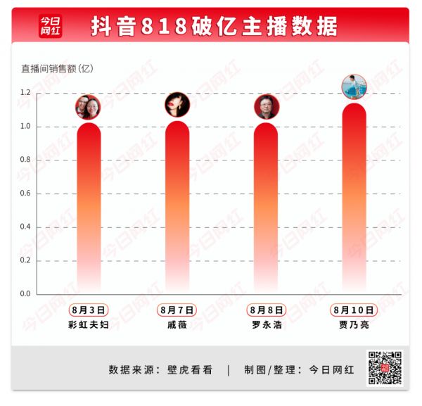 8月3日,近段时间冒头的主播彩虹夫妇直播间销售破亿,GMV1.0亿。随后,交个朋友旗下的明星主播戚薇,在8月7日场的直播场GMV破亿,GMV1.02亿。接着才是老罗,8月8日,GMV1.0亿。