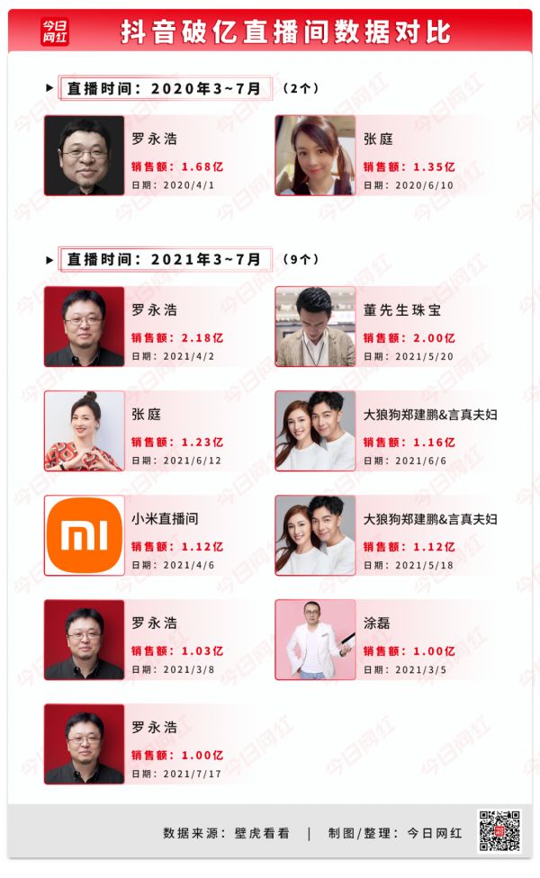 2021年,抖音破亿直播间有8个,翻了4倍。其中罗永浩占了2个,一个是3月8日的女神节活动场,一个是4月2日的直播一周年活动场。