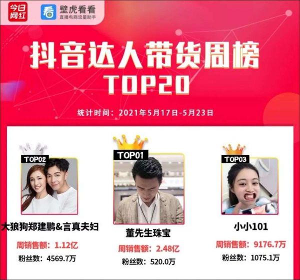 其中,董先生珠宝单场GMV破2亿,一举打破了抖音珠宝专场的带货记录,他也借此一战成名。而从去年就开始带货的大狼狗郑建鹏&言真夫妇,他们在今年通过延续去年的成熟经验,加上借助天气丹返场,在618期间两次破亿。