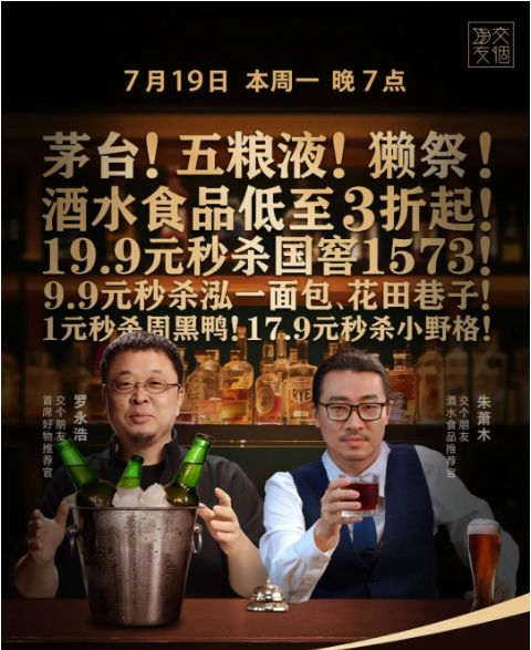 在主账号如此勤奋的情况下,老罗在7月19日还推出了交个朋友之酒水食品的新账号,专注于酒水和食品的垂直类目,账号目前的主理人是朱萧木,老罗仅在首播场作为助场初主播出现了一次。