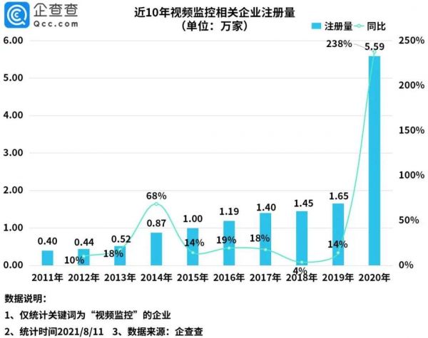 企查查数据显示,从注册量来看,2014年国内视频监控相关企业注册量增长率出现小高峰,同比增长68%,注册量达8700余家;2020年相关企业注册量达历年来最高,达5.59万家,同比增长238%。