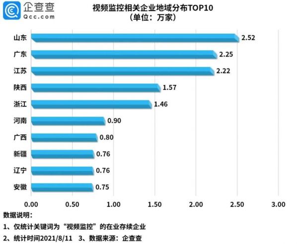 从地域分布来看,企查查数据显示,国内视频监控相关企业主要分布在山东、广东、江苏、陕西等地,其中山东省数量最多,达2.52万家;广东、江苏在第二梯队,分别有2.25家和2.22家。