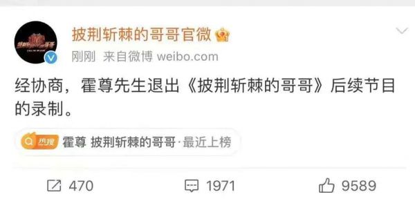 12日晚,记者发稿前,“哥哥”官方微博发布消息称:经协商,霍尊退出后续节目录制。