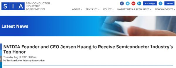 据美国半导体工业协会(SIA)官方消息,英伟达CEO黄任勋将获得芯片行业的最高荣誉:罗伯特 · 诺伊斯奖(Robert N.Noyce Award)。