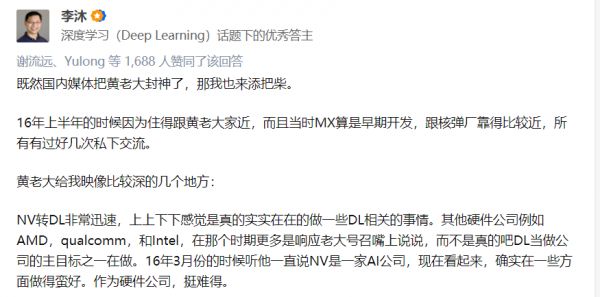 对于黄教主对AI推动,亚马逊首席科学家李沐曾经在知乎上评论: